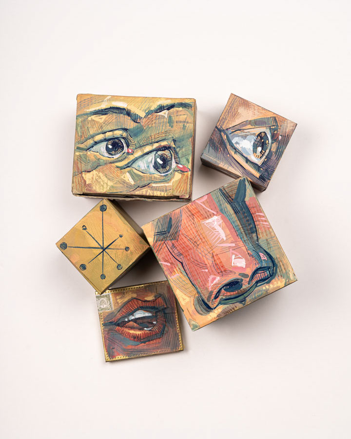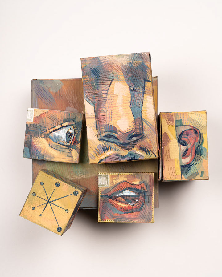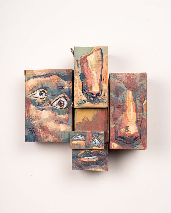 Using pictorial techniques on recycled cardboard, CVBØIDS constructs an emotional geography grounded in materiality and ephemerality. The living texture of the manually intervened boxes generates shifting forms that reveal intimate contradictions and silent inner landscapes.